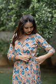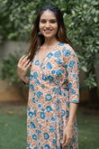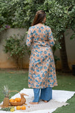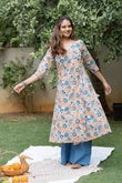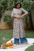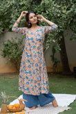 Flaunt your ethnic side in absolute luxury and style in this Peach Floral Kurta Set. Tailored with peach and blue contrasting colours and beautiful blue piping details of the kurta, this kurta set will add extra charm to your daily wardrobe!